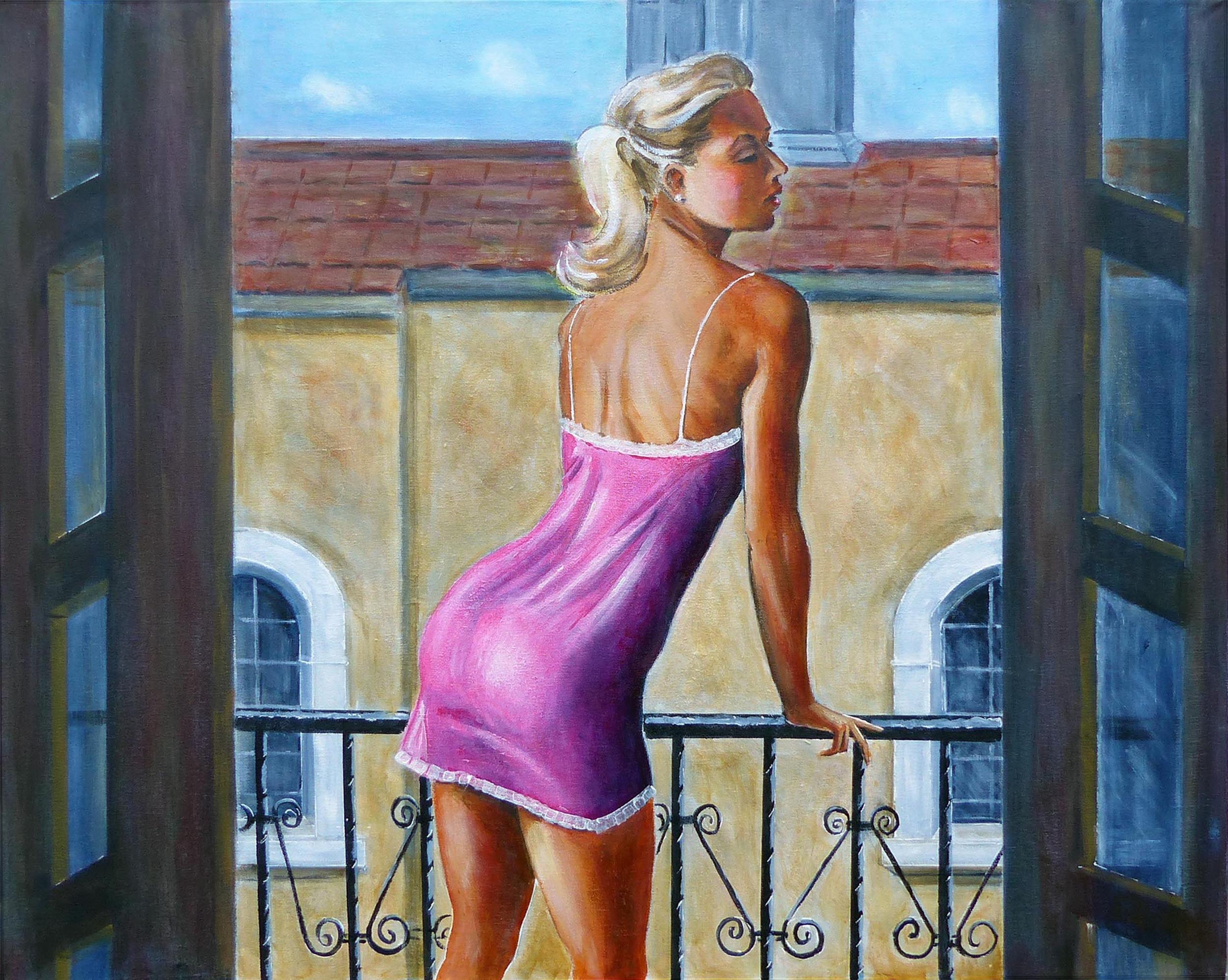 Ref: X0055. ‘JENNI ON THE BALCONY’. Acrylic and Oil on Canvas. Size: 24″ x 30″. Price: £895.00
