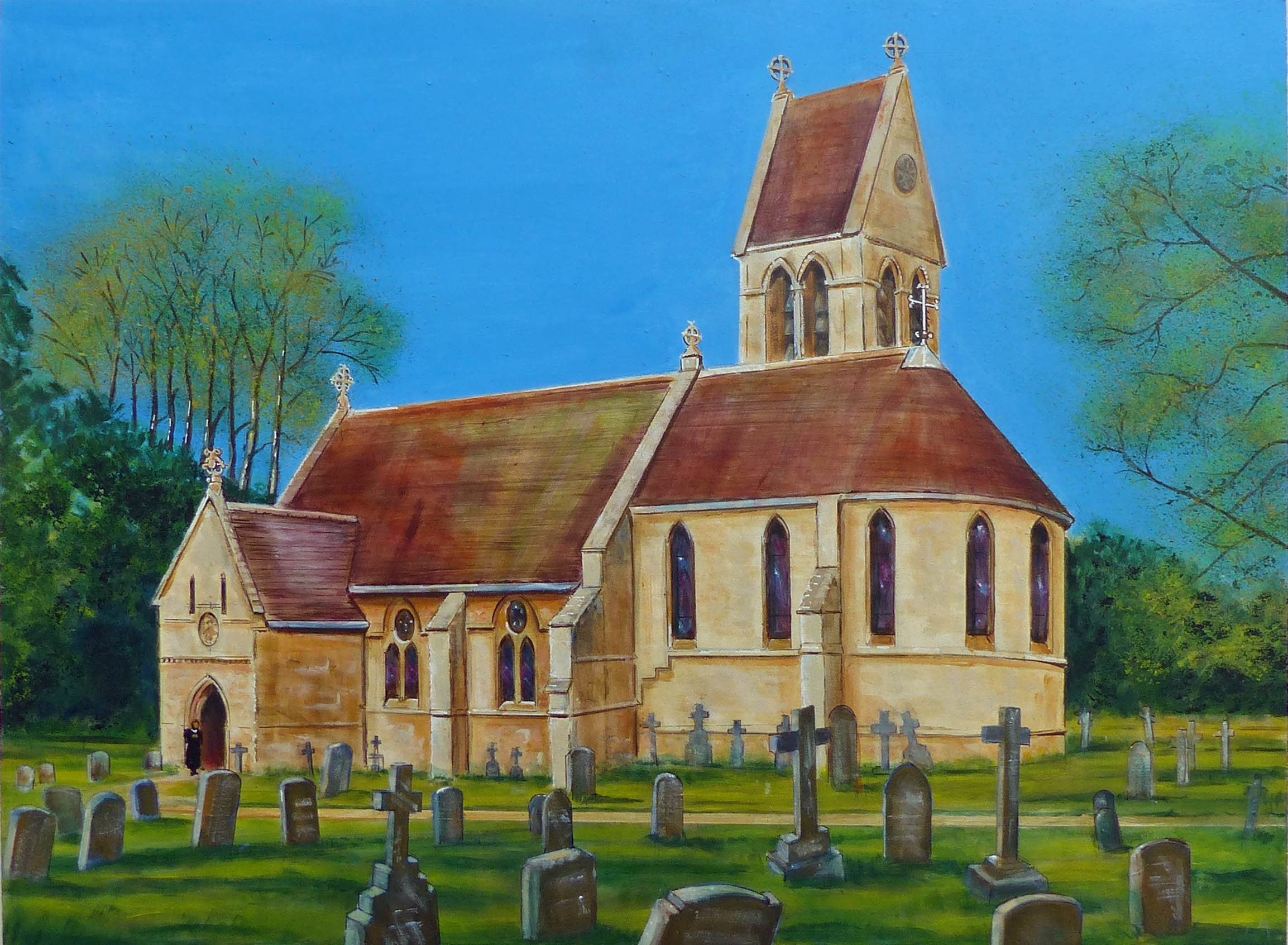 REF: X0059. ‘ST. MARY THE VIRGIN, FREELAND’. Acrylic on Board. Size: 18″ x 24″. Price: £495.00