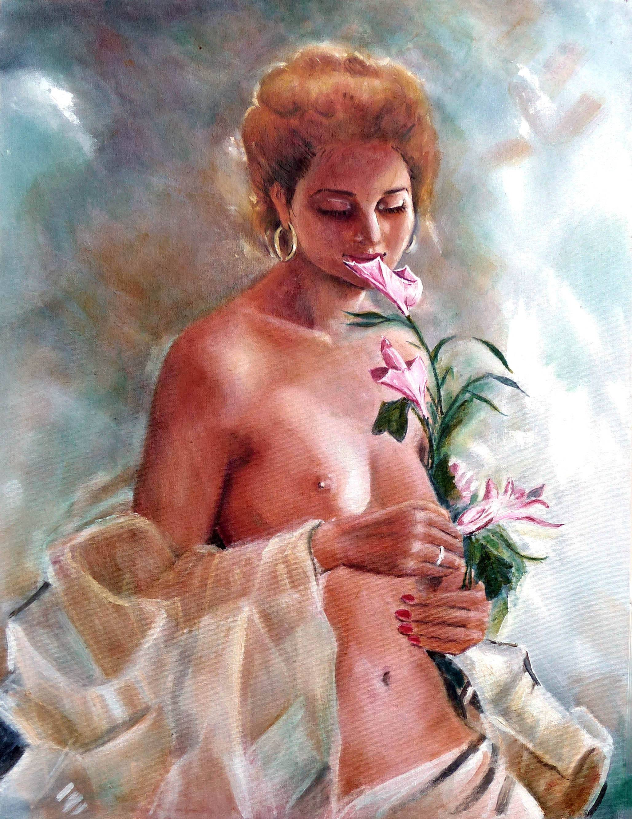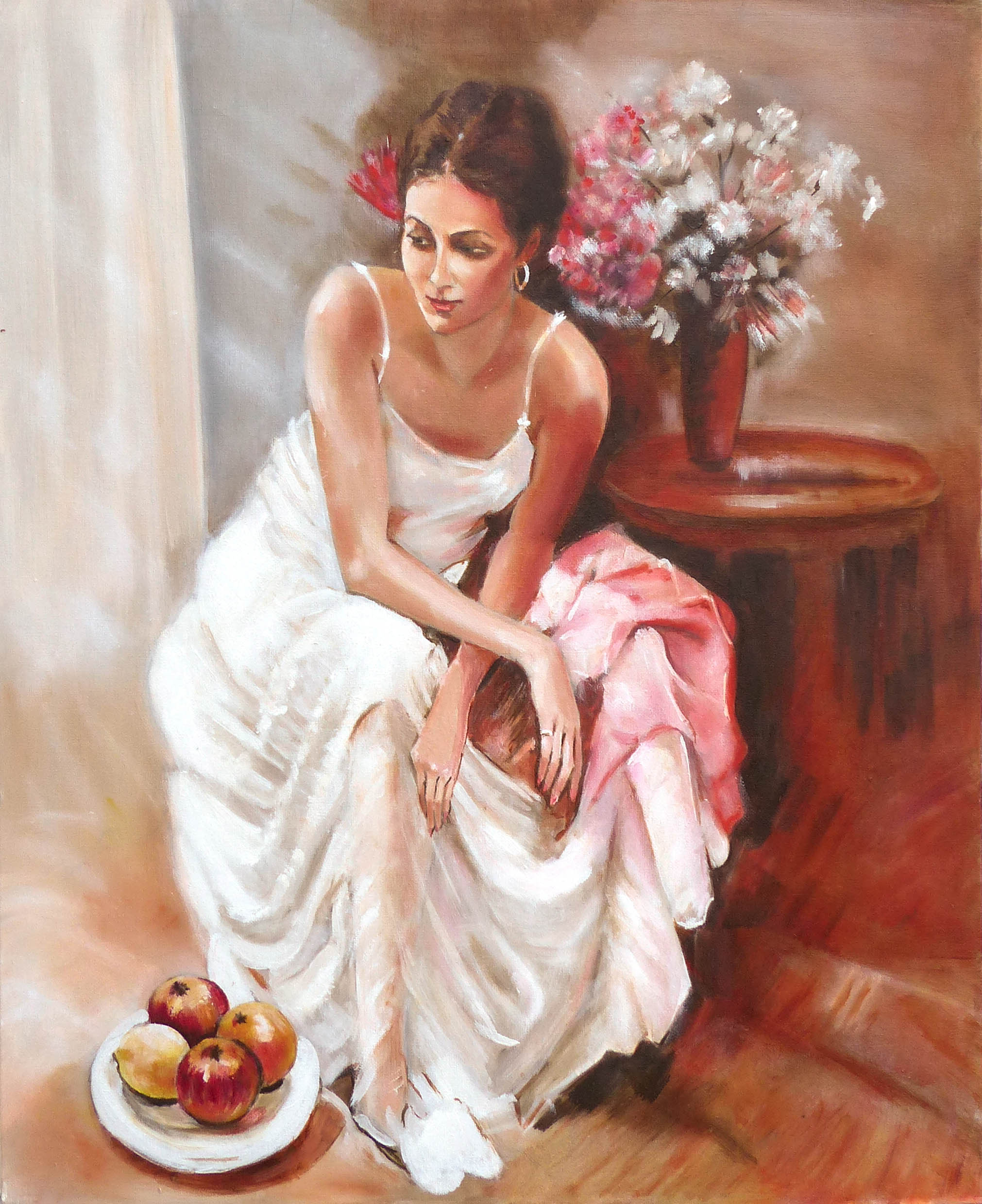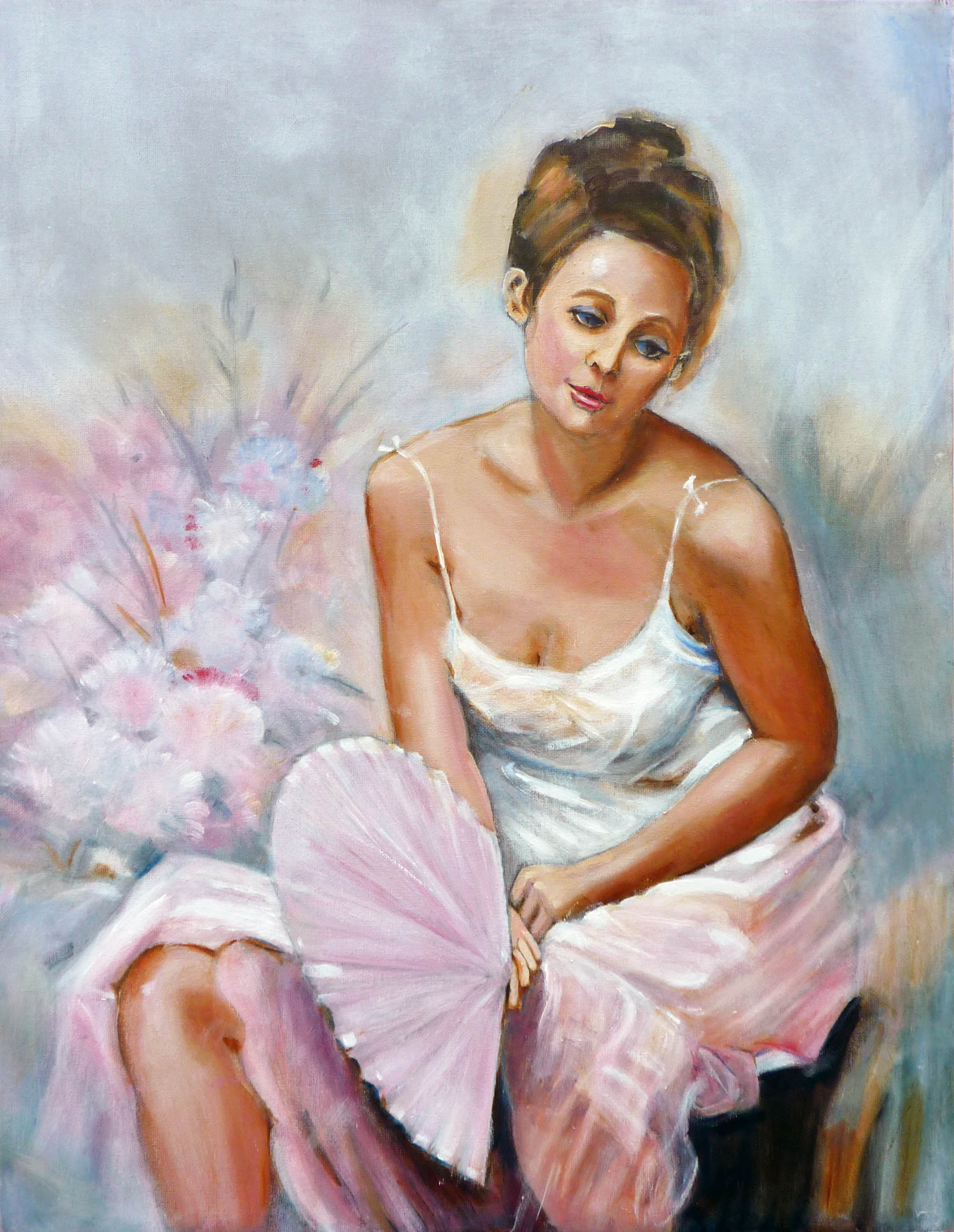 Ref: X0071. ‘GIRL WITH GARDENIAS IN HER HAIR’. Oils on Canvas Board. Size: 18″ x 24″. Price: £695.00